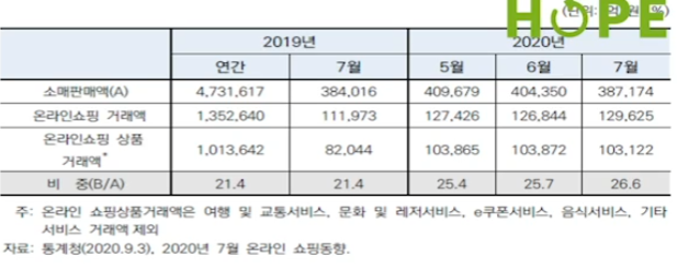 특히 2020년 7월 기준 온라인 쇼핑 거래액은 약 13조원으로 전체 소매판매액 중 26.6%를